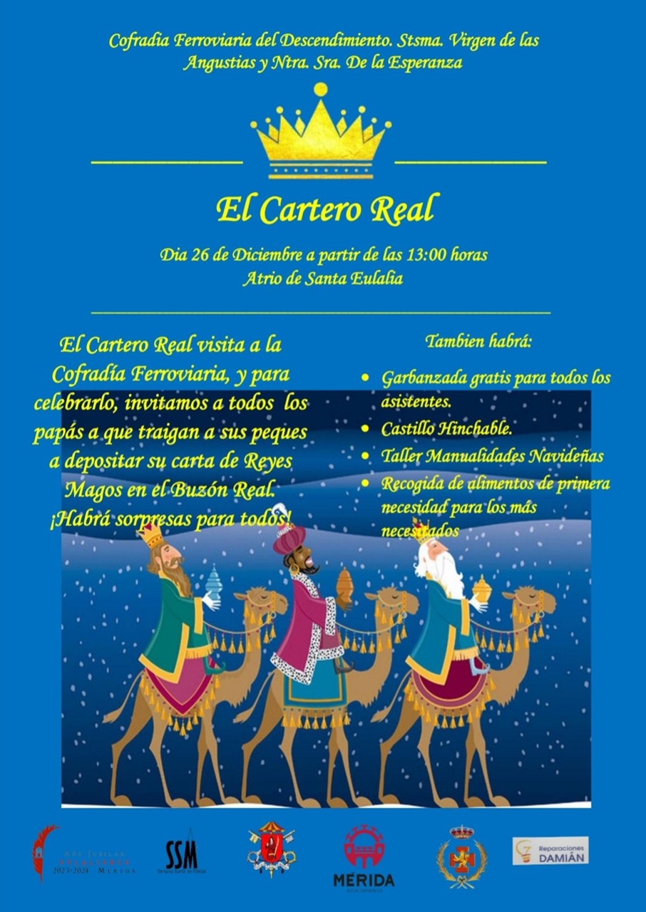 El lunes 26 de diciembre, a las 13:00 horas, llegará a la Basílica Santa Eulalia el Cartero Real para que todos los niños y niñas puedan entregar sus cartas a los Reyes Magos. Se contará con hinchables, talleres infantiles y muchas sorpresas. También, habrá recogida de alimentos y, a partir de las 14:00 horas, se degustará una garbanzada. Organiza la Cofradía Ferroviaria