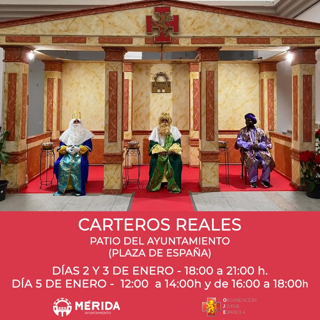 Los carteros reales estarán en el Patio del Ayuntamiento, en la Plaza de España, los días 2 y 3 de enero de 2025 en horario de 18:00 a 21:00 horas. También, el domingo 5 de enero en horario de 12:00 a 14:00 y de 16:00 a 18:00 horas. Colabora OJE Mérida