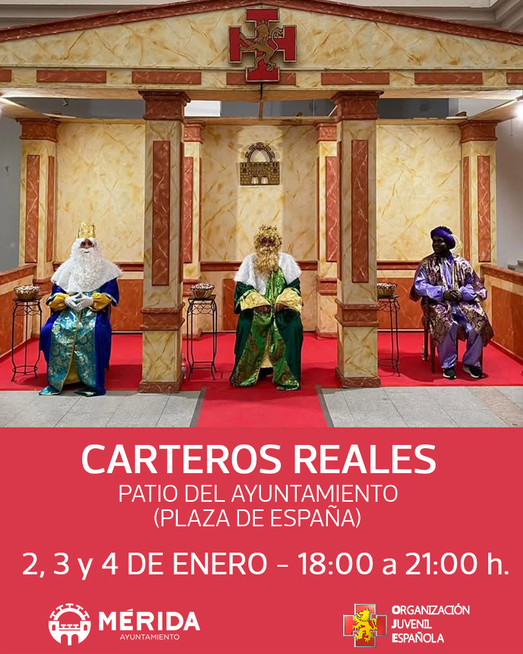 Los carteros reales estarán en el Patio del Ayuntamiento, en la Plaza de España, los días 2, 3 y 4 de enero de 2026 en horario de 18:00 a 21:00 horas, para recoger las cartas de los más pequeños. Colabora OJE Mérida