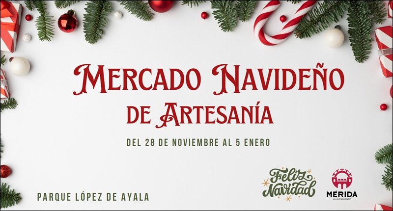 Parque López de Ayala Mérida&nbps; Del 28 de noviembre de 2025 al 5 de enero de 2026, estará instalado en el Parque López de Ayala el Mercado Navideño de Artesanía que incluye también numerosas actividades como talleres, actuaciones musicales o cuentacuentos que se irán anunciando próximamente.