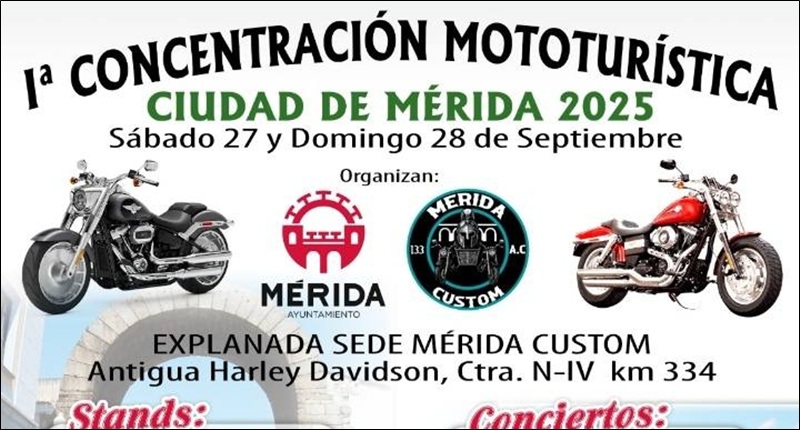 La asociación cultural Mérida Custom organiza la 1ª Concentración Mototurística Ciudad de Mérida 2025 los días 27 y 28 de septiembre cargada de actividades que incluyen rutas turísticas, concursos, música, exposición de vehículos clásicos, stands solidarios, etc |