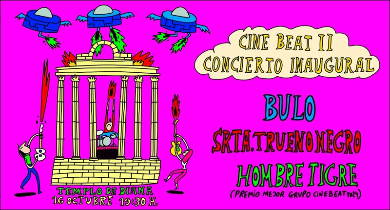 El jueves 16 de octubre, a las 19:30 horas, el Templo de Diana acoge el concierto inaugural de la II edición del Festival de Cine y Música de Mérida CineBeat con las actuaciones de los grupos Hombre Tigre (19:30h), Srta. Trueno Negro (21:00h) y Bulo (22:00h).