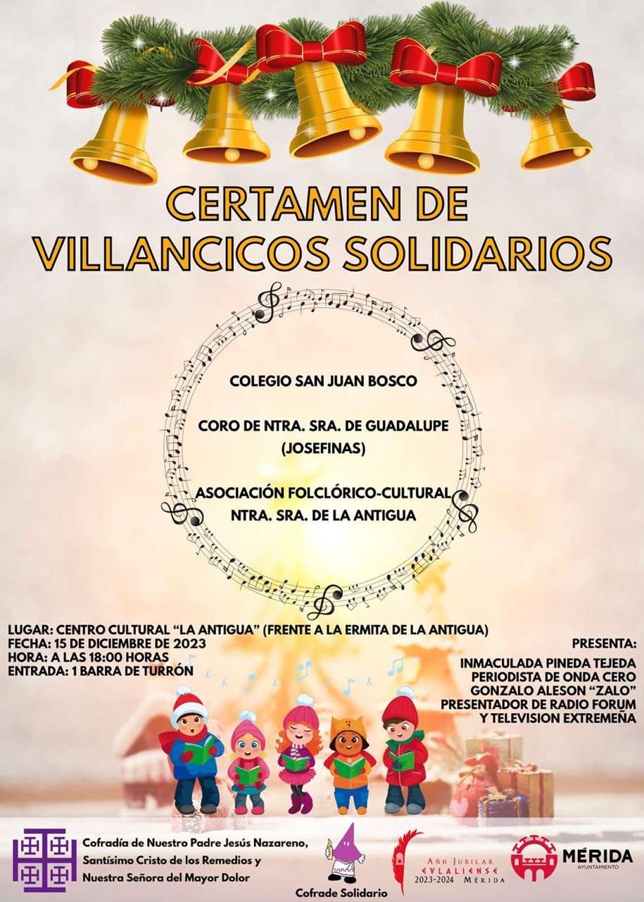 El viernes 15 de diciembre, a partir de las 18:00 horas, el Centro Cultural de La Antigua acoge el Certamen de Villancicos Solidarios organizado por la Cofradía de Nuestro Padre Jesús Nazareno con la participación de Colegio San Juan Bosco, el Coro de las Josefinas y la Asociación Folklórica de la Antigua. Entrada: una barra de turrón.