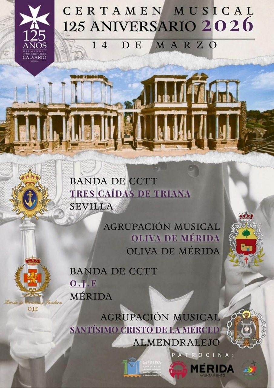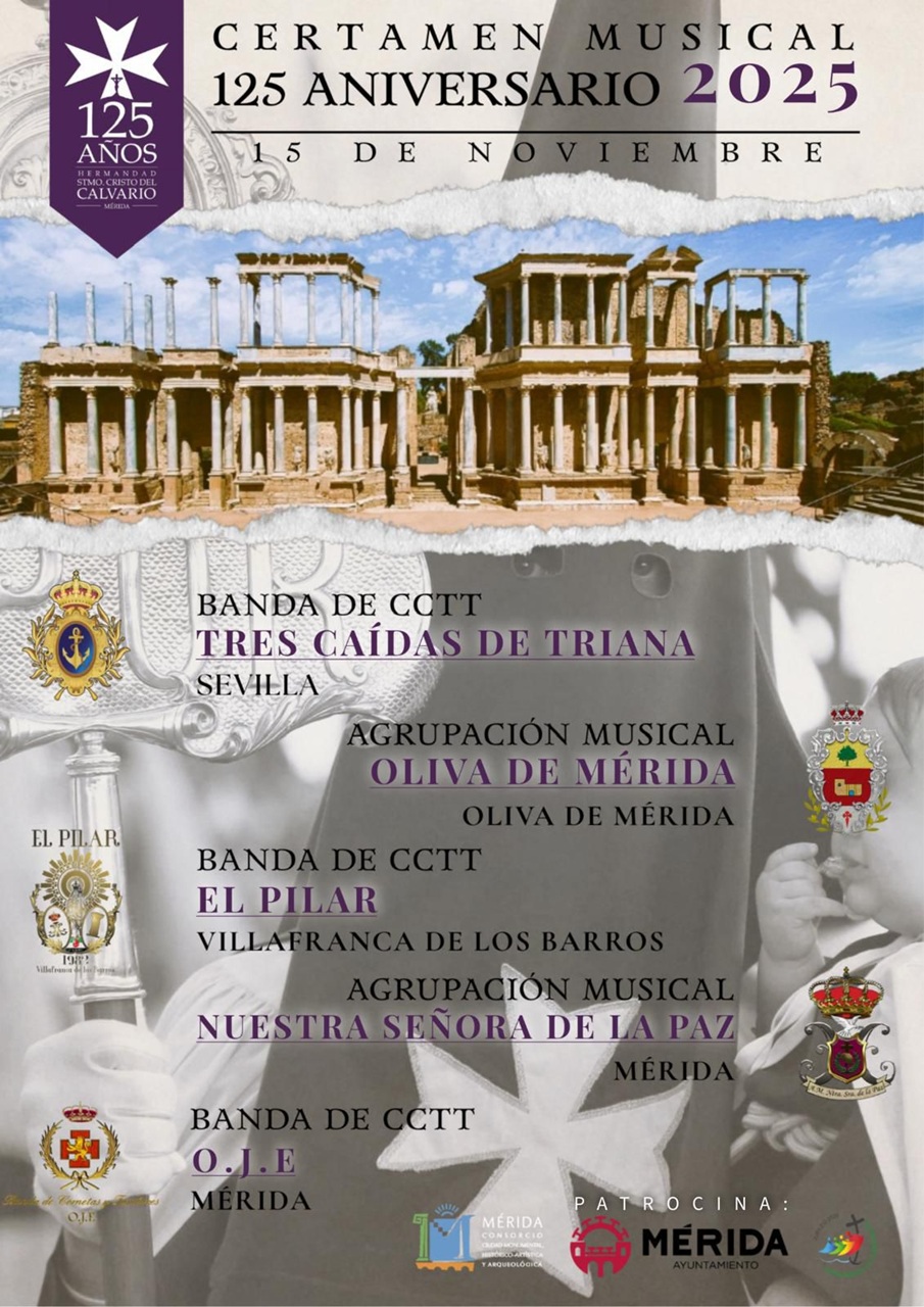 El Teatro Romano acogerá un certamen musical especial por el 125 Aniversario Hermandad del Calvario el sábado 15 de noviembre, a partir de las 17:30 horas, en el que participarán la Banda de Cornetas y Tambores de la OJE de Mérida, la Agrupación Musical Nuestra Señora de La Paz, Banda de Cornetas y Tambores “Virgen del Pilar” de Villafranca de los Barros, Agrupación Musical La Oliva de Mérida, cerrando el cartel la Banda de Cornetas y Tambores del Santísimo Cristo de las Tres Caídas de Triana. La entrada es libre aunque también se pude hacer una pequeña donación para causas sociales.