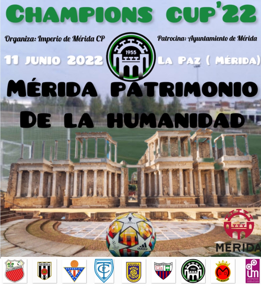 El sábado 11 de junio, desde las 9:30 horas, el Complejo Polideportivo La Paz acoge la Champions Cup 2022 Mérida Patrimonio de la Humanidad organizado por el Imperio de Mérida CP con la participación de las mejores canteras de Extremadura en categoría Prebenjamín, Benjamín y Cadete.