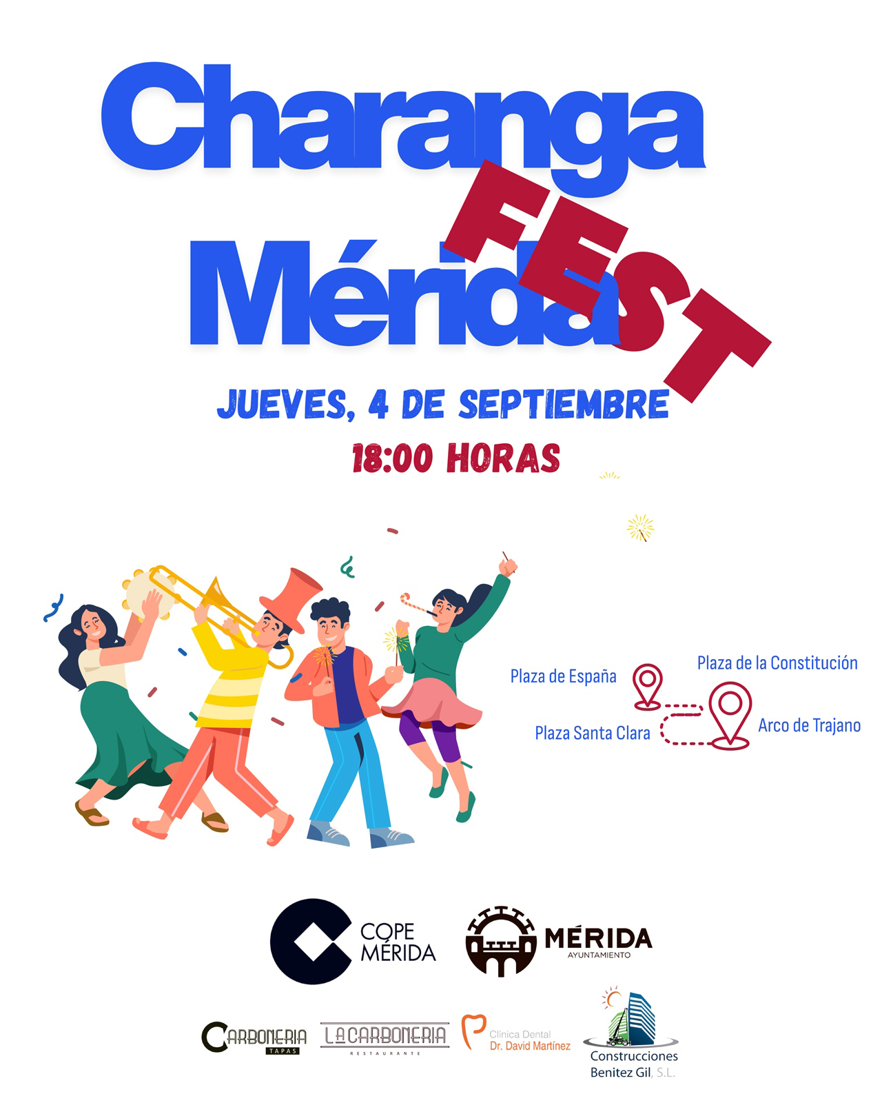 La Feria de Mérida 2025 vivirá el jueves, 4 de septiembre, la celebración del Charanga Mérida Fest que, desde las 18:00 horas, se celebrará en las principales calles del centro de la ciudad, en concreto en la Plaza de la Constitución, Plaza de España, Plaza de Santa Clara, Arco de Trajano y Templo de Diana.