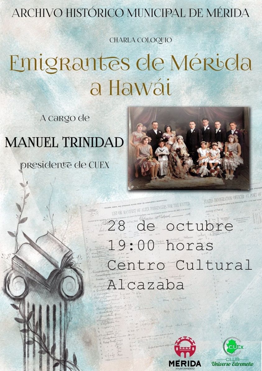 Así, con el título de Migrantes de Mérida a Hawai 1913, el Presidente del Club Universo extremeño, Manuel Trinidad, dará una charla mañana jueves, 28 de octubre a las 19 horas, en la rotonda del Centro Cultural Alcazaba.