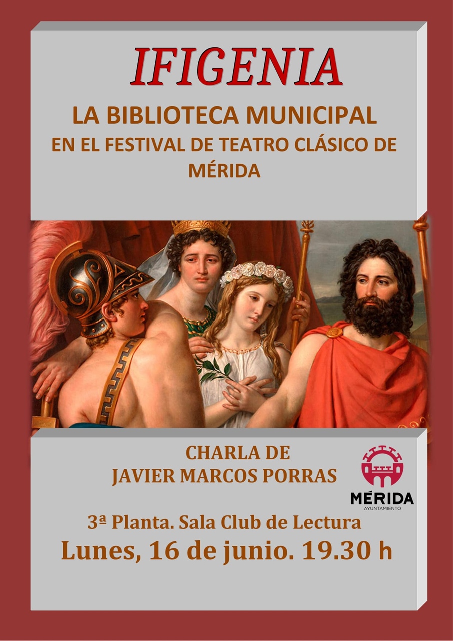 El próximo lunes 16 de junio a las 19:30h. en la 3º planta de la Biblioteca Municipal ‘Juan Pablo Forner’, Javier Martos, monitor de los Clubes de Lectura en español, ofrecerá una interesante charla sobre IFIGENIA, obra que se podrá disfrutar en el Festival Internacional de Teatro Clásico de Mérida de este año los días 15 y 16 de julio.