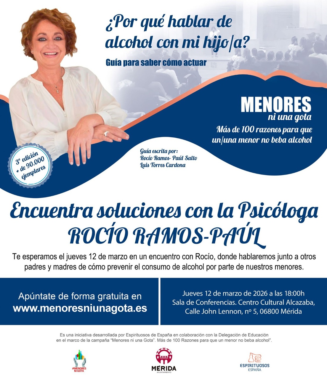 El 12 de marzo, a las 18:00 h, en el Centro Cultural Alcazaba, Espirituosos España y Ayuntamiento de Mérida organiza un nuevo encuentro dentro del programa “Menores ni una Gota”, impartido por la psicóloga Rocío Ramos-Paúl, dirigido a familias y educadores para prevenir el consumo de alcohol en menores.