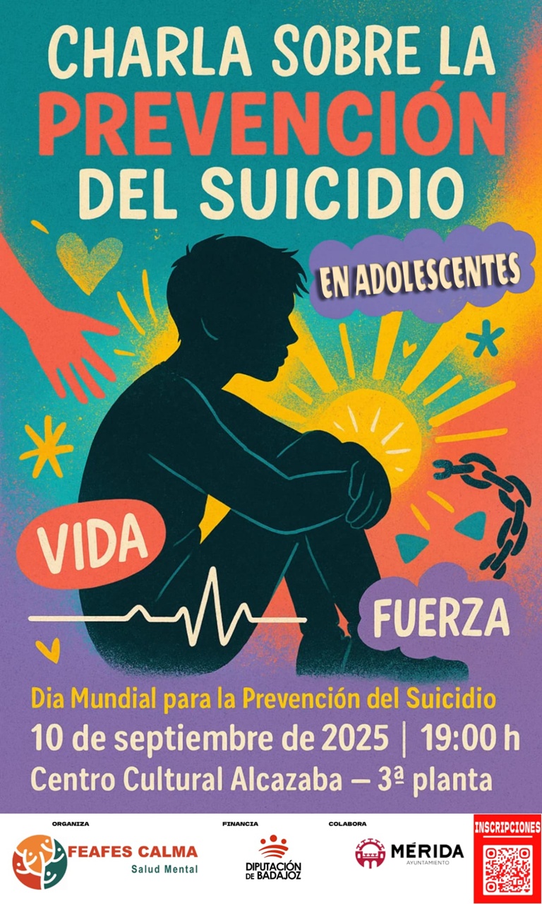 El próximo miércoles 10 de septiembre, a las 19:00 horas, el Centro Cultural Alcazaba acoge una Charla con motivo de la conmemoración del Día Mundial para la Prevención del Suicidio. Se trata de una actividad organizada por Feafes Calma-Salud Mental, en colaboración con el Ayuntamiento de Mérida y que cuenta, a su vez, con la financiación de la Diputación de Badajoz.