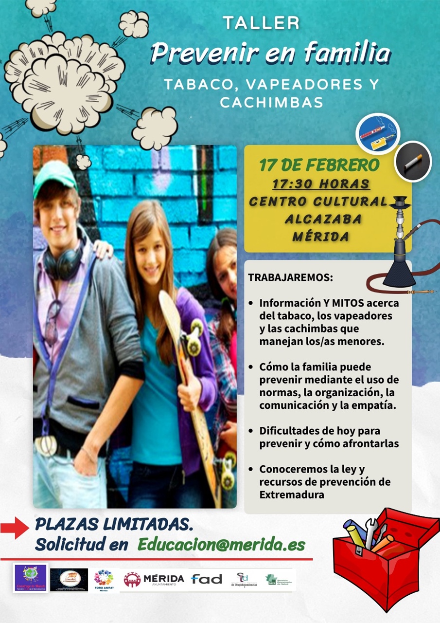El Foro de Ampas de Mérida organiza, este jueves 17 de febrero, una charla/taller ‘Prevenir en Familia’ para prevención de conductas adictivas entre jóvenes (tabaco, vapeadores y cachimbas) que impartirá la Fundación de Ayuda contra la Drogadicción. A las 17:30, en el Centro Cultural Alcazaba