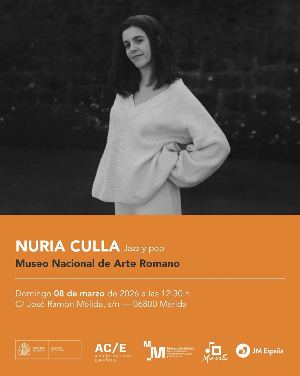 El 8 de marzo, a las 12:30 horas, se podrá disfrutar en directo de Nuria Culla en el Museo Nacional de Arte Romano dentro del ciclo MusaE que organiza el Ministerio de Cultura y Acción Cultural Española AC/E. Se trata de una cantante, guitarrista y compositora de Donostia que comenzó su trayectoria como solista en 2013, moviéndose entre el indie-pop y el folk alternativo, además de interpretar versiones cercanas al rock y al jazz.