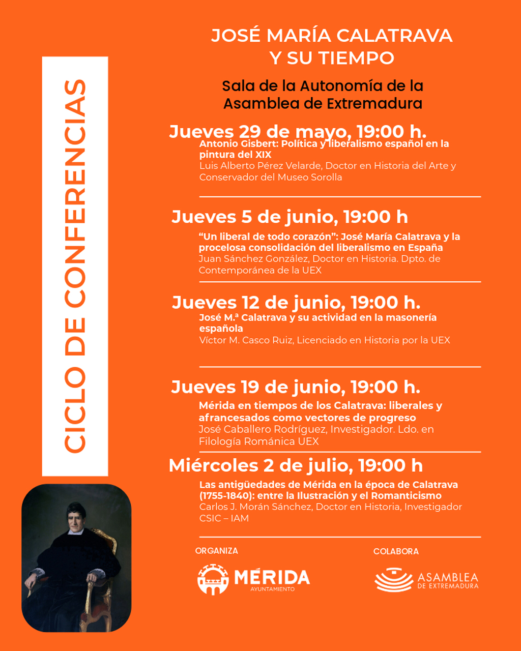 El Ayuntamiento de Mérida homenajeará al emeritense José María Calatrava con un ciclo de conferencias todos los jueves, desde el 29 de mayo hasta el 26 de junio, a las 19:00 horas, en la Sala de la Autonomía de la Asamblea de Extremadura.