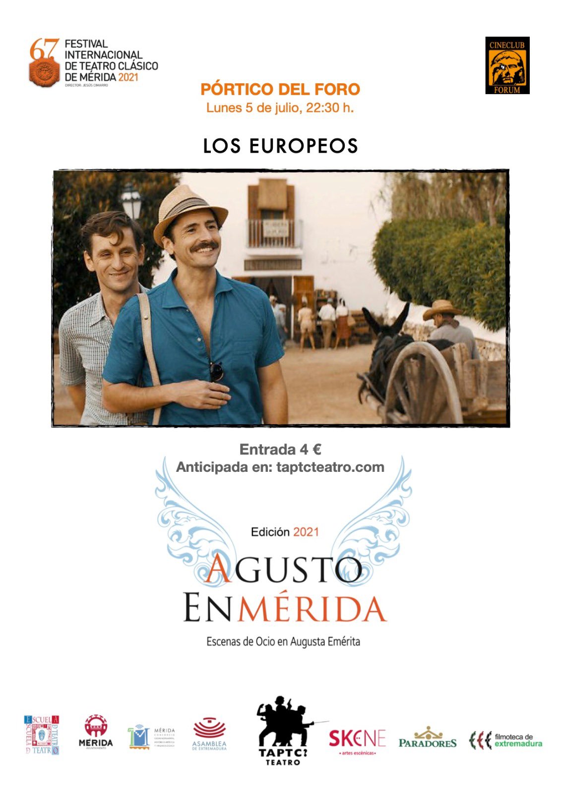 Actividad enmarcada dentro de la programación de ‘Agusto en Mérida 2021’ organizada por TAPTC Teatro y que forma parte de las actividades paralelas del 67 Festival de Teatro Clásico de Mérida. La programación cinematográfica del ciclo para la edición 2021 está elaborada por Cine Club Forum, a partir de la idea de Javier Llanos y vuelve a incluirse dentro de la oferta general de la Filmoteca de Extremadura.