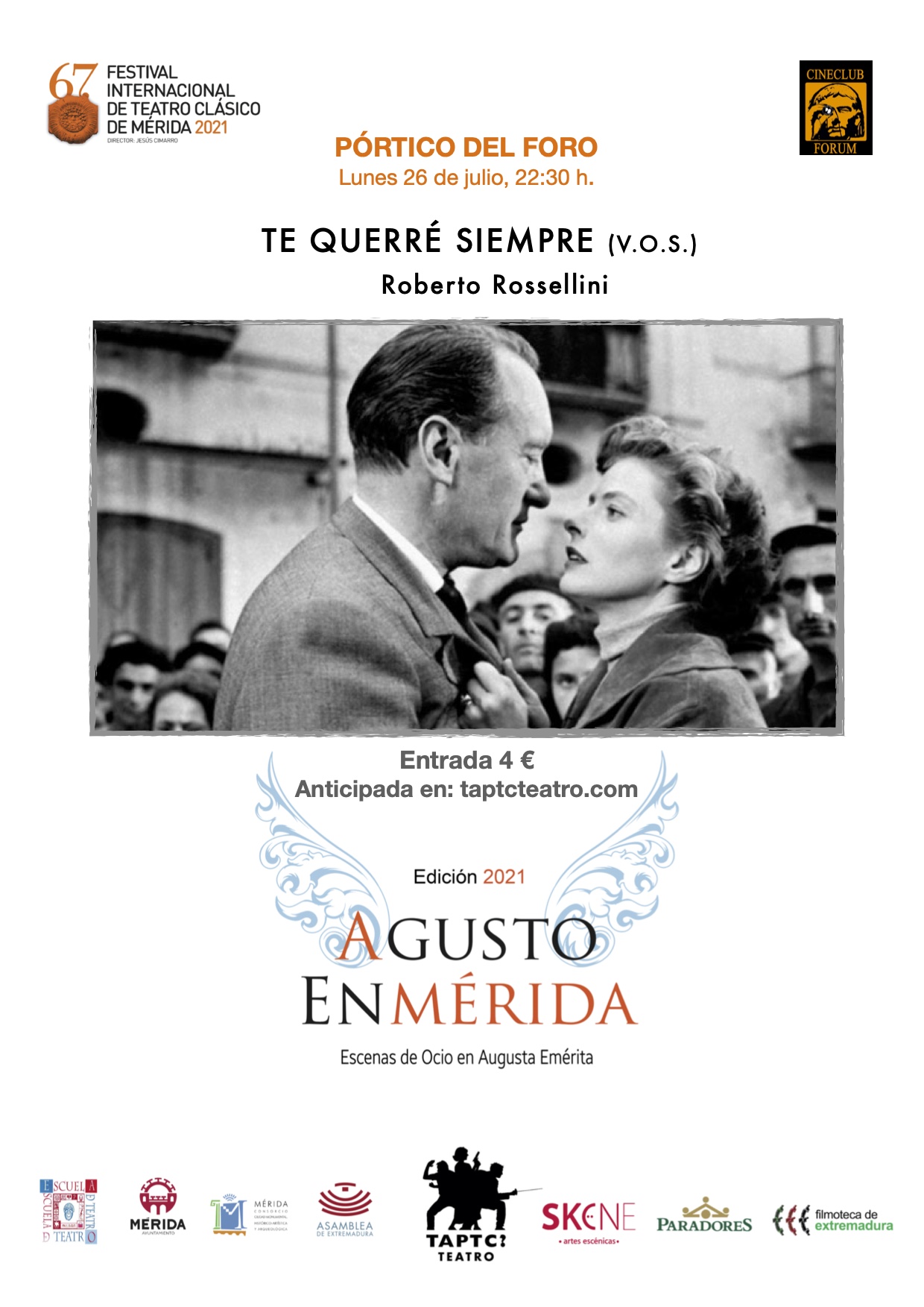 Actividad enmarcada dentro de la programación de ‘Agusto en Mérida 2021’ organizada por TAPTC Teatro y que forma parte de las actividades paralelas del 67 Festival de Teatro Clásico de Mérida. La programación cinematográfica del ciclo para la edición 2021 está elaborada por Cine Club Forum, a partir de la idea de Javier Llanos y vuelve a incluirse dentro de la oferta general de la Filmoteca de Extremadura. Entrada: 4€