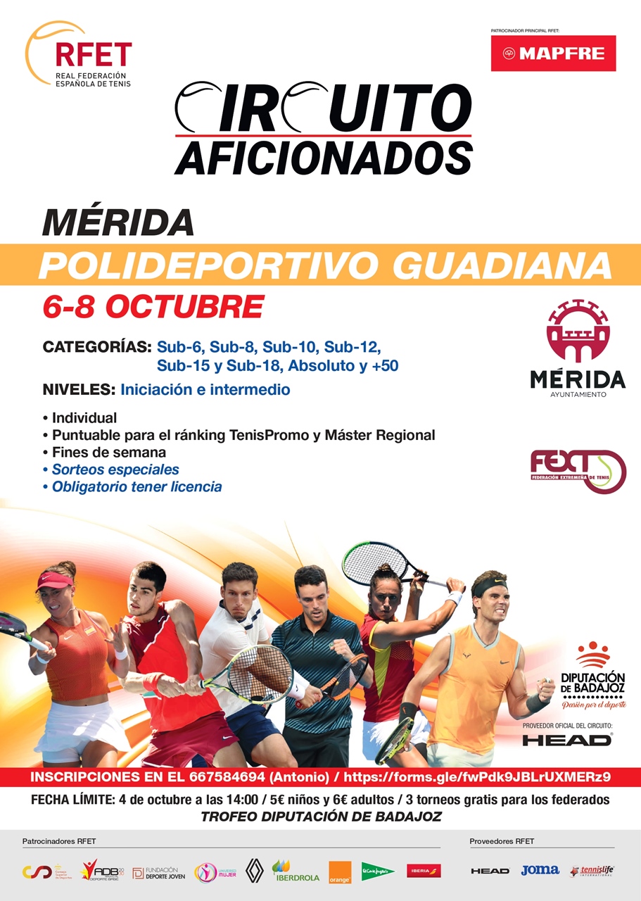 Del 6 al 8 de octubre, llega al Polideportivo Guadiana, el Circuito Aficionados de Tenis España, un torneo dirigido a niños y adultos, nivel iniciación e intermedio. El precio de la inscripción es de 5€ niños y 6€ adultos y la fecha límite es el 4 de octubre.