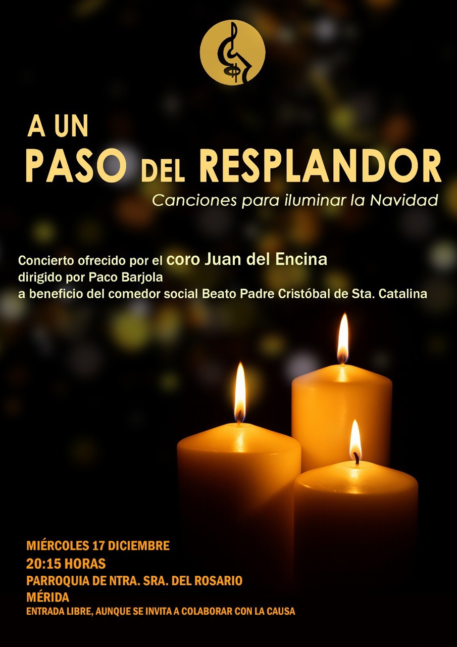 El Coro Juan del Encina dirigido por Paco Barjola ofrecerá un concierto de Navidad bajo el título «A un paso del resplandor» el miércoles 17 de diciembre, a las 20:15 horas, en la Parroquia del Rosario (Barriada de Santa Eulalia). Será a beneficio del Comedor Social Beato Padre Cristóbal de Santa Catalina.