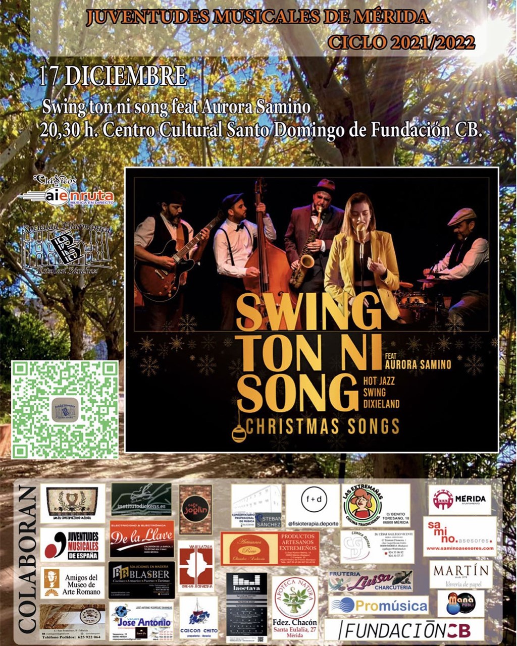 Este próximo viernes 17 de diciembre, a las 20:30 horas, en el Auditorio del Centro Cultural Santo Domingo de la Fundación CB de Mérida, tendrá lugar un concierto de Jazz a cargo del grupo SWING TON NI SONG & AURORA SAMINO organizado por la Sociedad Filarmónica «Esteban Sánchez»- Juventudes Musicales de Mérida e interpretarán un sugerente repertorio de música navideña. La entrada será gratuita hasta completar aforo.