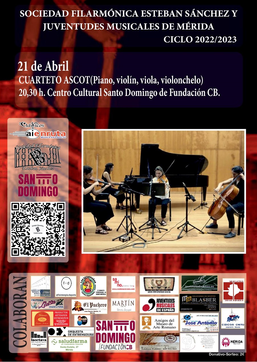 El viernes 21 de abril, a las 20:30 horas, el Auditorio del Centro Cultural Santo Domingo de la Fundación CB acoge un concierto del Cuarteto Ascot compuesto por Celia Molina, violín; Clara Rivière, violonchelo; Esther Fernández, viola e Irene Comesaña, piano, que ofrecerán un variado y novedoso repertorio de música española con obras de Rosa García Ascot, Elena Romero, Joaquín Turina y Fernando Remacha.