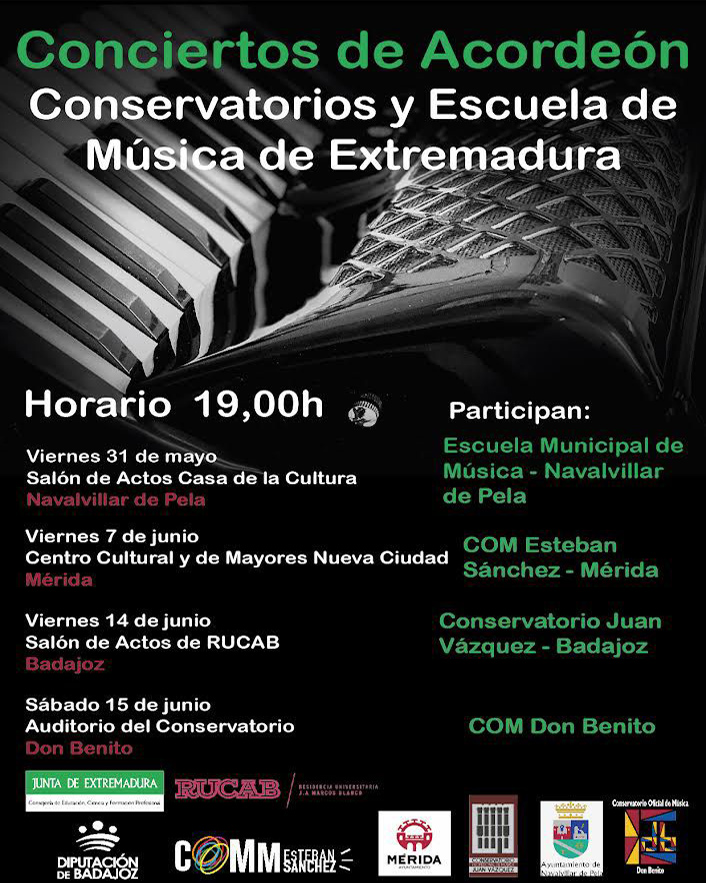 El viernes 7 de junio, a las 19:00 horas, el Centro Cultural de Nueva Ciudad acoge un Concierto de Acordeón a cargo del alumnado de los conservatorios Esteban Sánchez de Mérida, Badajoz y Don Benito además de la Escuela de Música de Navalvillar de Pela. Entrada libre