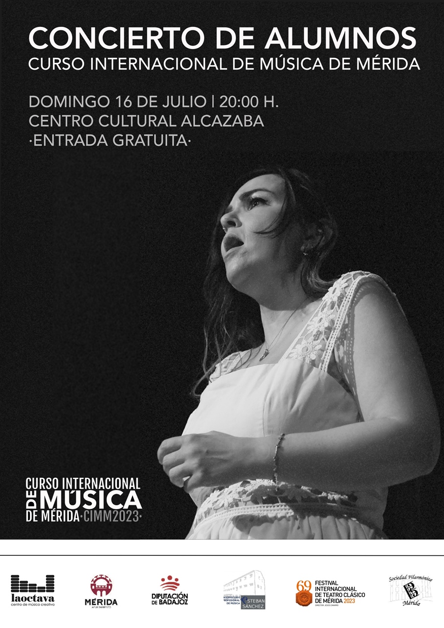 El Centro Cultural Alcazaba acoge el domingo 16 de julio, a partir de las 20:00 horas, el Concierto de los Alumnos del curso de Canto e Interpretación que forma parte del Curso Internacional de Música de Mérida que organiza Laoctava, centro de Música Creativa como parte de las actividades paralelas del Festival de Teatro Clásico de Mérida. Entrada libre hasta completar aforo.