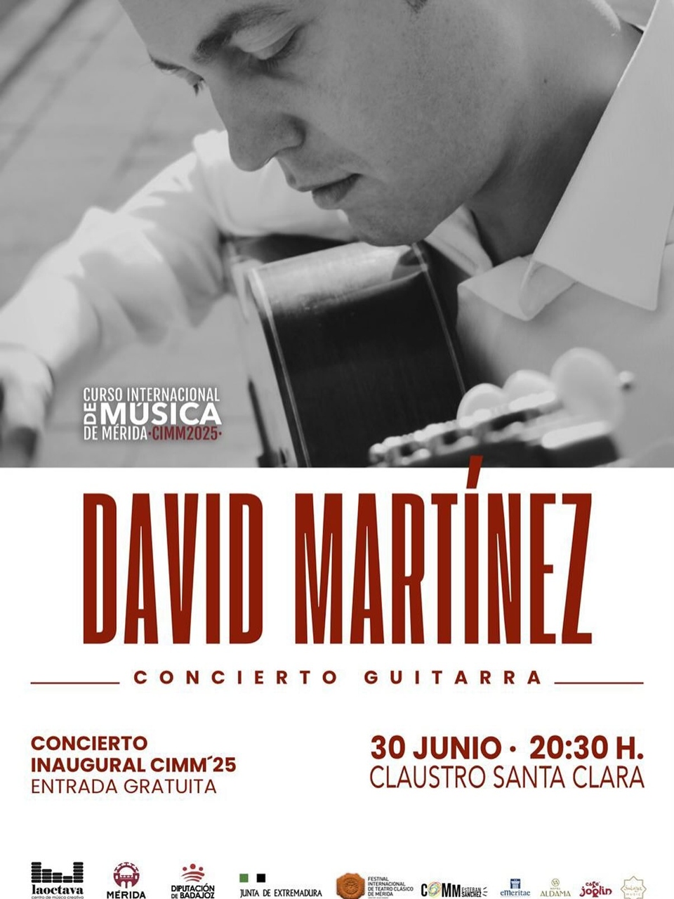 El lunes, 30 de junio, el gran guitarrista David Martínez ofrecerá un concierto en el Claustro de Santa Clara (Sede del Festival de Mérida) a las 20:30 horas. Un concierto organizado por LaOctava, centro de música creativa, que servirá para inaugurar el Curso Internacional de Música de Mérida CIMM25. La entrada es libre hasta completar aforo.