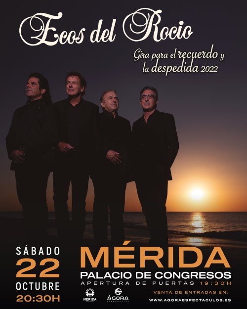 Tras cuarenta años de dedicación a la música, Ecos del Rocio vuelve a reencontrarse con su público en su “Gira para el Recuerdo y la Despedida”, donde presentarán novedades de su nuevo disco y harán un recorrido por toda su discografía, no solo las canciones más escuchadas, sino también aquellos temas que además de ser grandes éxitos, son los más significativos para los fieles seguidores de los Ecos.