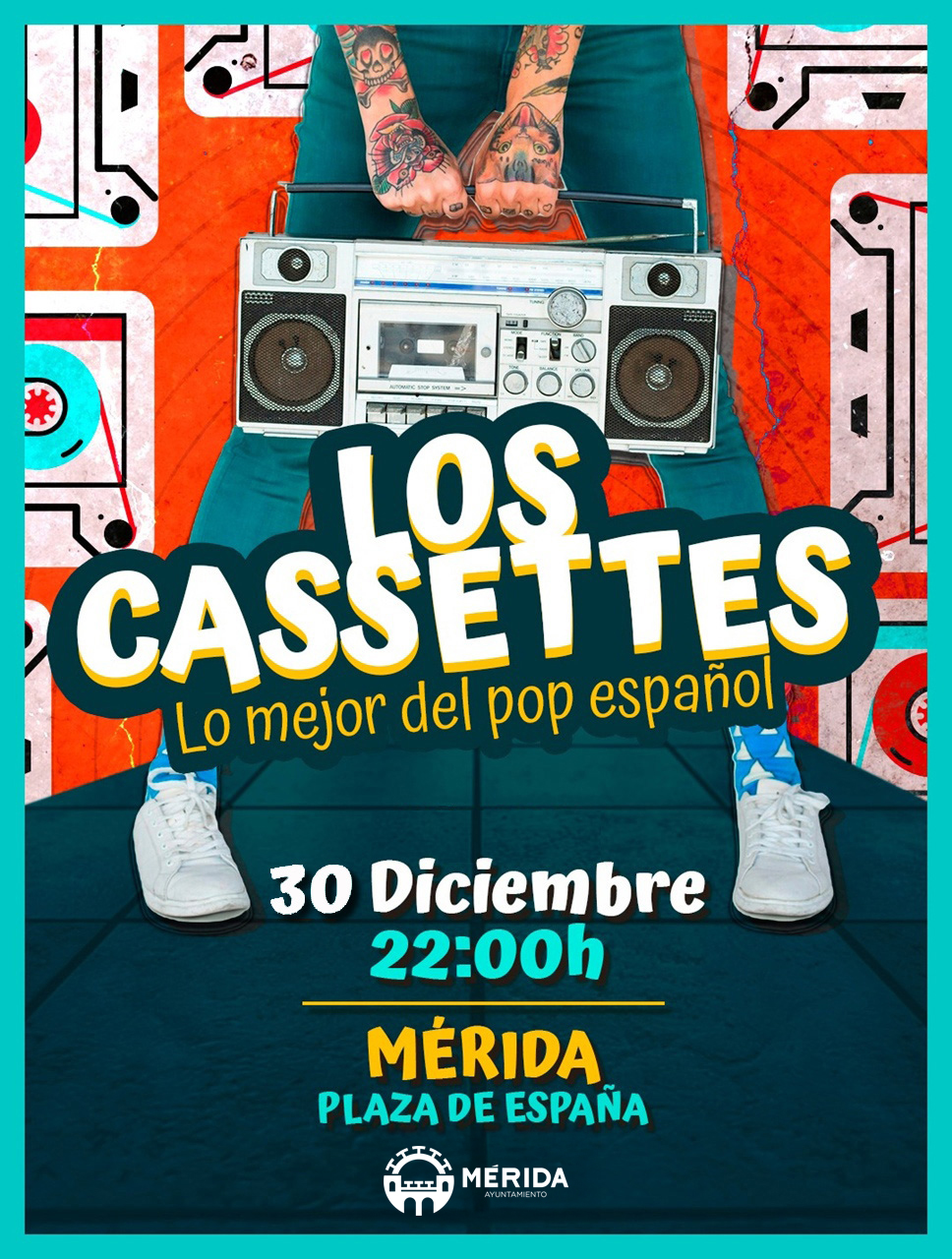 El martes 30 de diciembre, a partir de las 22:00 horas, la Plaza de España acogerá el concierto de Los Cassettes, un grupo originario de Cáceres dedicado a interpretar versiones de temas del pop y rock en castellano de las décadas de los 80 y 90. Su repertorio incluye canciones de artistas como La Frontera, Tam Tam Go, Celtas Cortos, Antonio Vega y Danza Invisible. La banda está formada por Manuel Reyes (voz y guitarra), Alberto Barrero (guitarra eléctrica y coros), Rubén Rubio (bajo eléctrico) y Antonio Pintor (batería).