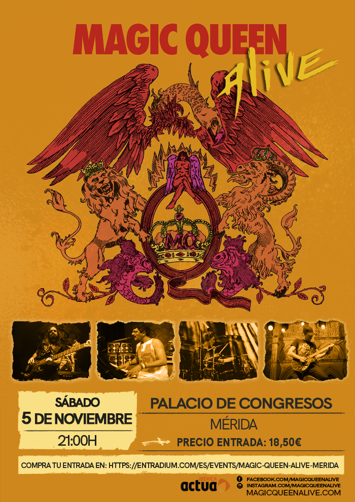 Vuelve Magic Queen Alive, el mejor homenaje de Queen de España, al Palacio de Congresos de #Mérida, el próximo sábado 5 de noviembre. Un completo e intenso espectáculo de estos artistas extremeños que traslada al escenario la magia y la fuerza de una de las bandas más icónicas y eclécticas del siglo XX.