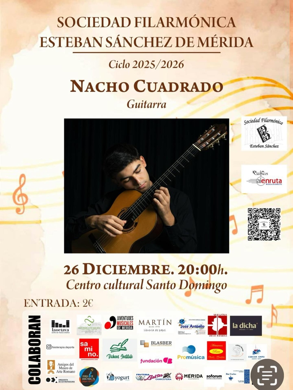 El viernes, 26 de diciembre, a las 20:00 horas, el Auditorio del Centro Cultural Santo Domingo de la Fundación CB acogerá un nuevo concierto de la Sociedad Filarmónica Esteba Sánchez a cargo del músico emeritense Nacho Cuadrado (guitarra), quien interpretará obras de Luigi Legnani, Giulio Regondi, Franz Schubert o Joaquín Turina, entre otros. Entrada: 2€