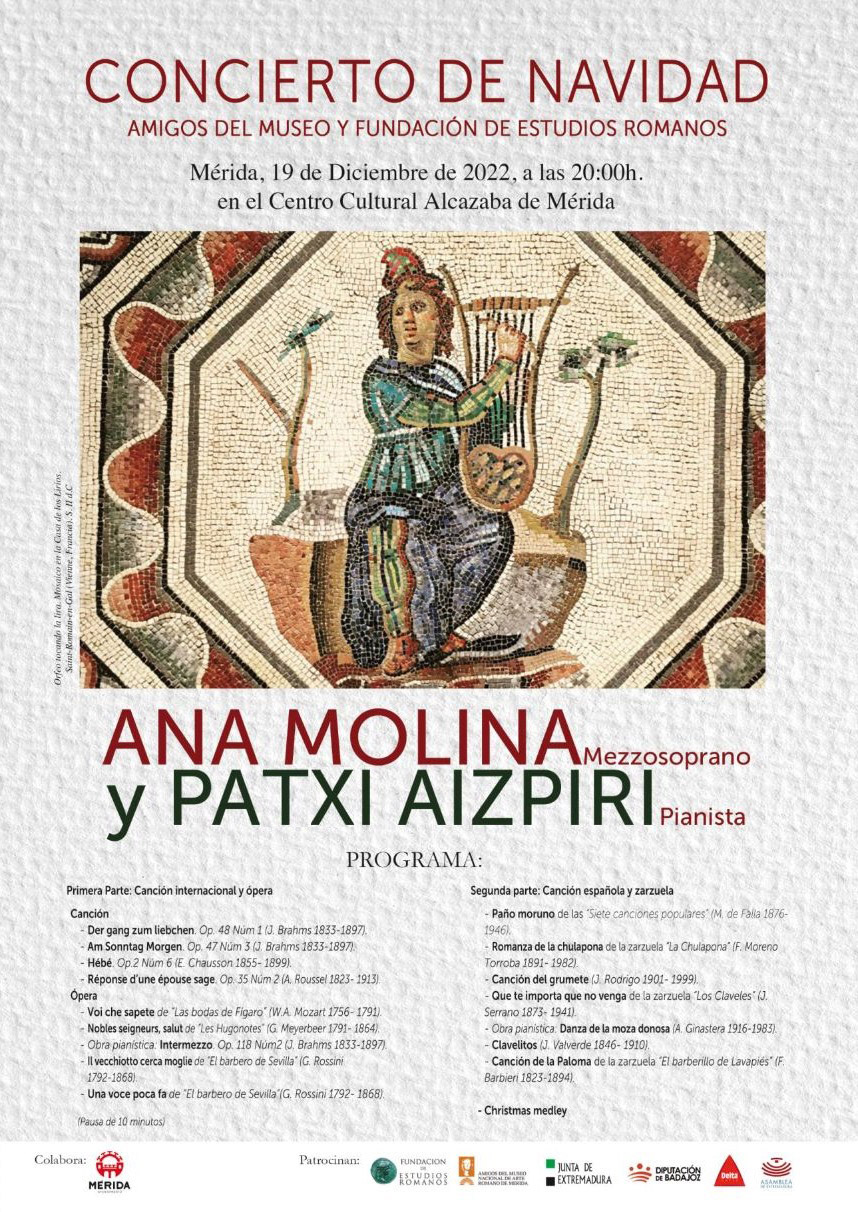 Los Amigos del Museo Nacional de Arte Romano y la Fundación de Estudios Romanos organizan un Concierto de Navidad, el lunes 19 de diciembre, con la actuación de Ana Molina (Mezzosoprano) y Patxi Aizpiri (Pianista). Interpretarán obras internacionales de Mozart, Brahms y Rossini, entre otros, y canción y zarzuela española.