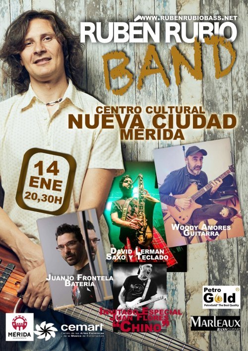 La noche del sábado 14 de enero, a las 20:30 horas, el Centro Cultural de Nueva Ciudad (en lugar de la Sala Trajano) está reservada para el concierto de Rubén Rubio, uno de los mejores bajistas y guitarristas del momento, donde nos ofrecerá temas de sus discos ‘Inexorable’ y ‘Biondo’. Rubén, que se mueve por distintos estilos como el jazz, rock, funk y algo de flamenco o folk, estará acompañado en esta ocasión por David Lerman, al teclado y saxo; Woody Amores, a la guitarra; Juanjo Frontela, a la batería, y como invitado espacial tocará también Juan Flores “Chino”.