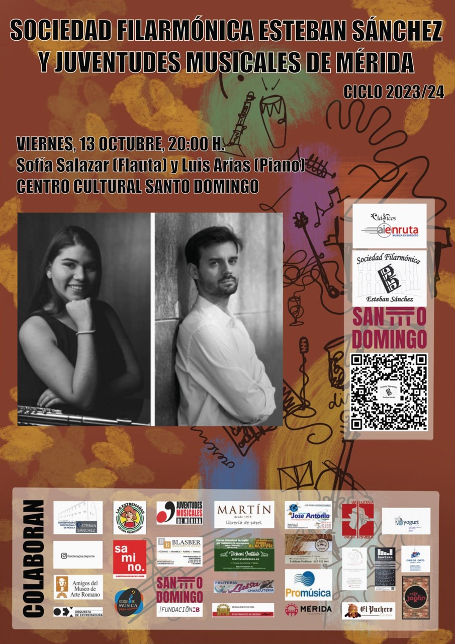 La Sociedad Filarmónica Esteban Sánchez/Juventudes Musicales de Mérida comienza una nueva temporada musical este próximo viernes, día 13 de octubre a las 20:00 horas, en el Auditorio del Centro Cultural Santo Domingo de la Fundación CB de Mérida de la mano de Clásicos en Ruta (AIE) con un concierto de flauta y piano a cargo de Sofía Salazar (flauta) y Luis Arias (piano), que interpretarán un interesante y variado programa con obras de Gabriel Fauré, Benjamín Godard, Joaquín Turina y Claude Debussy, entre otros.