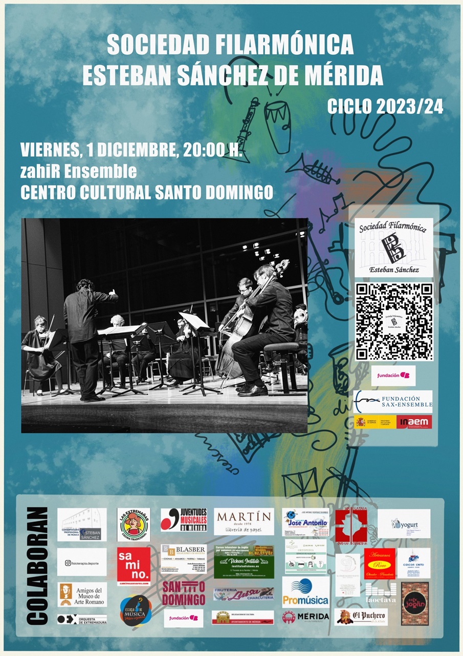 El viernes dia 1 de diciembre, a las 20:00 h, en el Auditorio del Centro Cultural Santo Domingo tendrá lugar un concierto a cargo del grupo ZAHIR ENSEMBLE, que desarrollará un programa con obras de JOHANNES BRAHMS, GABRIEL ERKOREKA y FÉLIX MENDELSSOHN BARTHOLDY. El concierto está organizado por la Sociedad Filarmónica «Esteban Sánchez» dentro de su ciclo de conciertos anual.