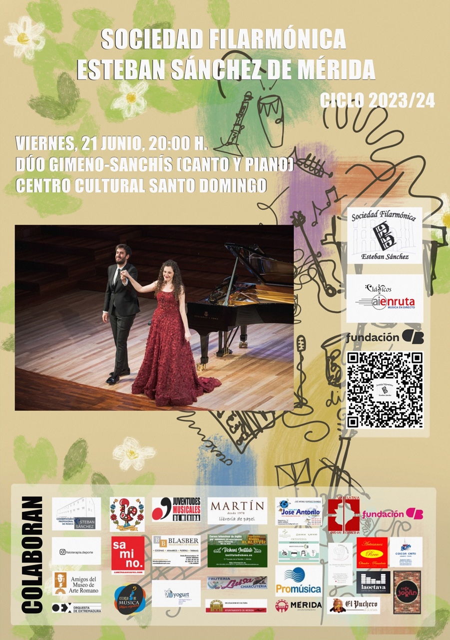 El viernes 21 de junio, a las 20:00 horas, en el Auditorio del Centro Cultural Santo Domingo de la Fundación CB de Mérida, tendrá lugar el concierto final de temporada de Clásicos en Ruta (AIE) a cargo del Dúo Gimeno-Sanchís, compuesto por Aida Gimeno García, soprano y Carlos Sanchís Aguirre, piano. Ambos intérpretes ofrecerán su programa “Melodías olvidadas”, un viaje por un repertorio que no dejará indiferente a nadie, por su estética, su calidad musical y por su belleza, con obras de L. Boulanger, F. Mompou, R. Chapí, J. Rodrigo, J. Turina y A. García Abril, entre otros. Este concierto viene una vez más de la mano. Entrada libre hasta completar aforo