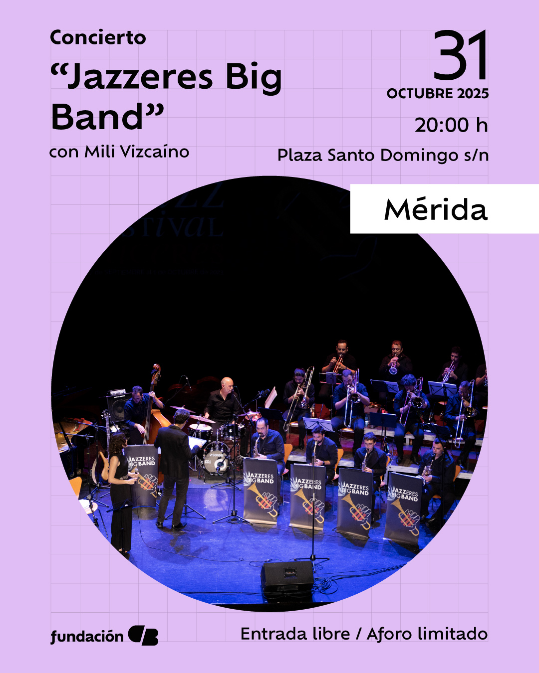 Jazzeres Big Band es una orquesta de jazz de gran formato compuesta por 18 músicos extremeños, en su mayoría profesores y exalumnos del Conservatorio “Hermanos Berzosa” de Cáceres. Bajo la dirección del contrabajista y arreglista Enrique Tejado, la banda interpretará un recorrido sonoro que va desde el swing de los años 30 (Benny Goodman, Glenn Miller) hasta compositores modernos como Chick Corea y Jaco Pastorius, sin olvidar grandes clásicos de Count Basie o Duke Ellington. La artista invitada será Mili Vizcaíno.
