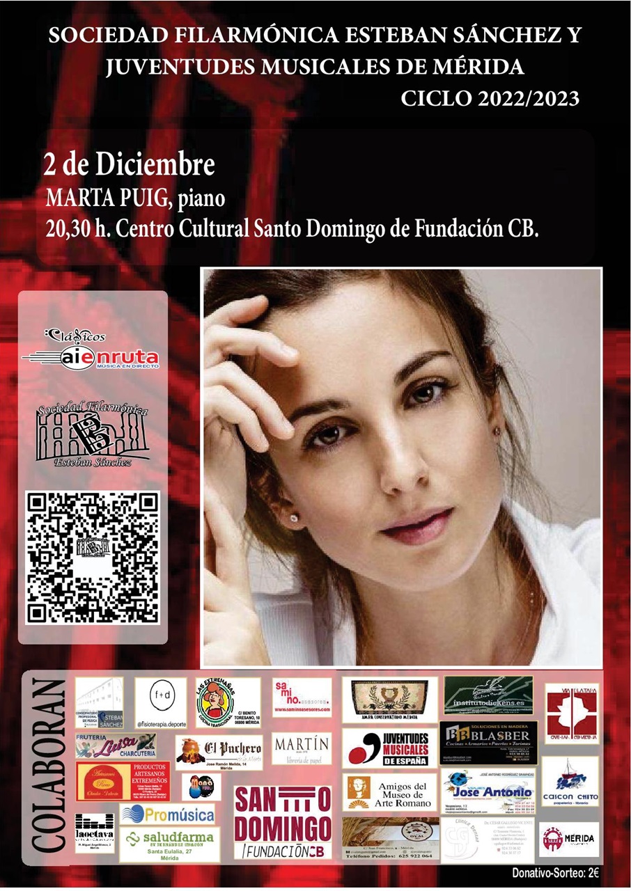El viernes 2 de diciembre, a las 20:30 horas, el Auditorio del Centro Cultural Santo Domingo de la Fundación CB acoge un concierto de piano a cargo de Marta Puig que interpretará obras de R. Schumann, K. M. Szymanowski, L. Janácek y F. Chopin.