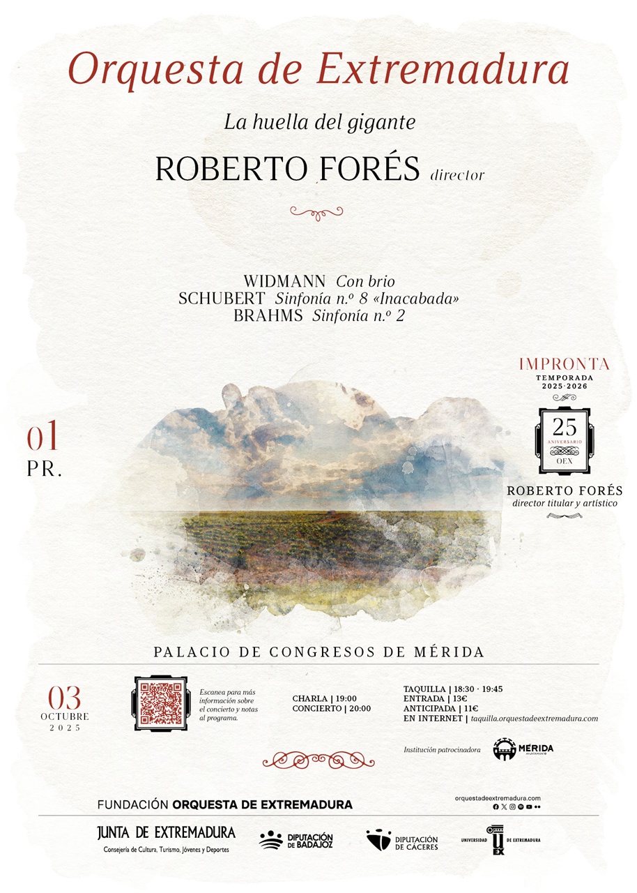 La Orquesta de Extremadura abre su temporada de abono de la mano de su nuevo titular, Roberto Forés, con una verdadera declaración de intenciones: la obertura Con brio, de Jörg Widmann. Música que, como la agricultura, incorpora la innovación pero bebe de las artes tradicionales: alusiones a Beethoven asumidas no como reliquia, sino como energía viva que se proyecta hacia el futuro. Una influencia que se rastrea en la enigmática Sinfonía Inacabada de Schubert y en un Brahms que ya ha dejado de temer los pasos del gigante.