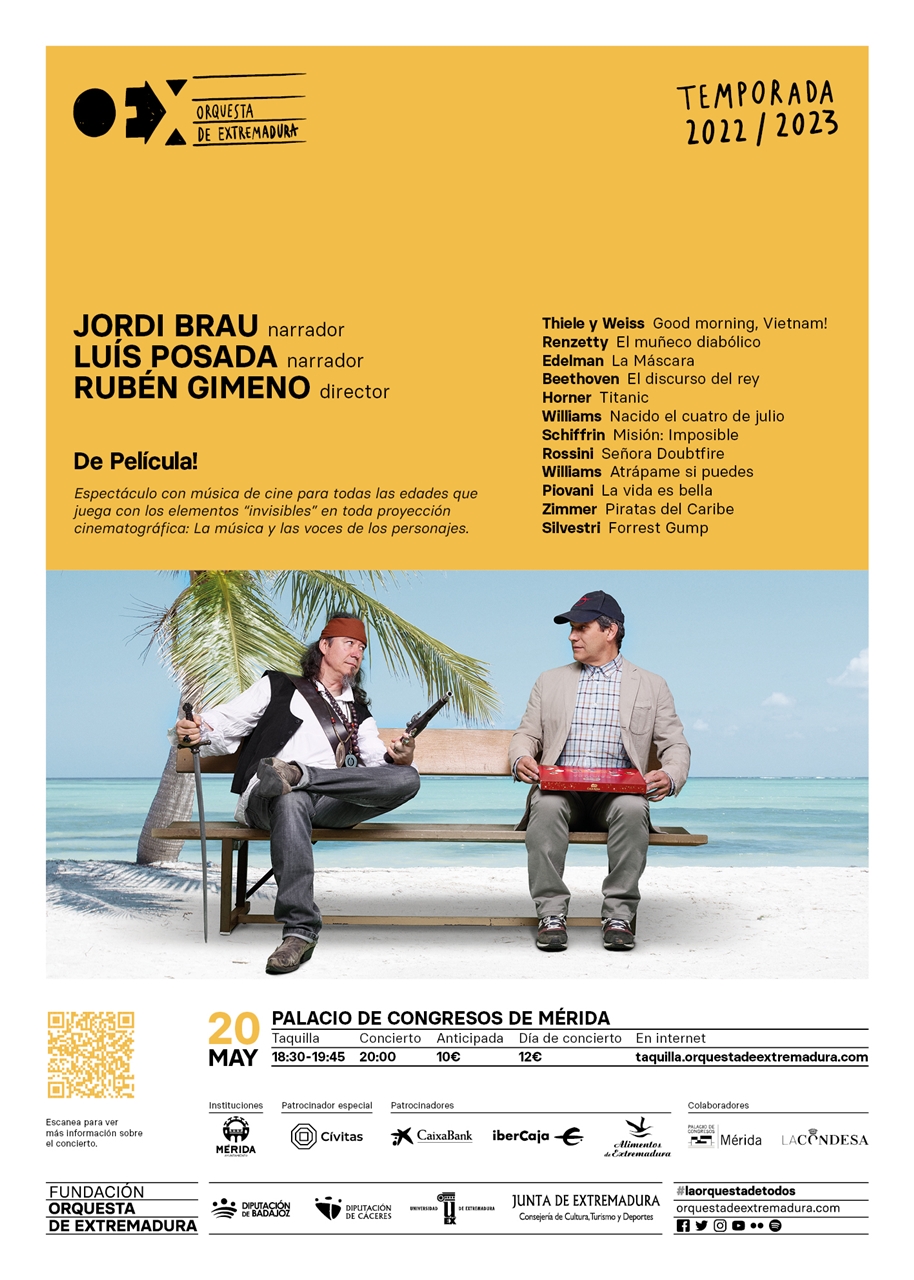 Espectáculo con música de cine para todas las edades que juega con los elementos “invisibles” en toda proyección cinematográfica: La música y las voces de los personajes. Este concierto presenta un formato diferente al que acostumbras. Los actores de doblaje Jordi Brau y Luís Posada presentan bandas sonoras de películas tan populares como Titanic, Forrest Gump, Piratas del Caribe o La vida es bella, con las voces de los protagonistas que, de seguro, vas a reconocer.
