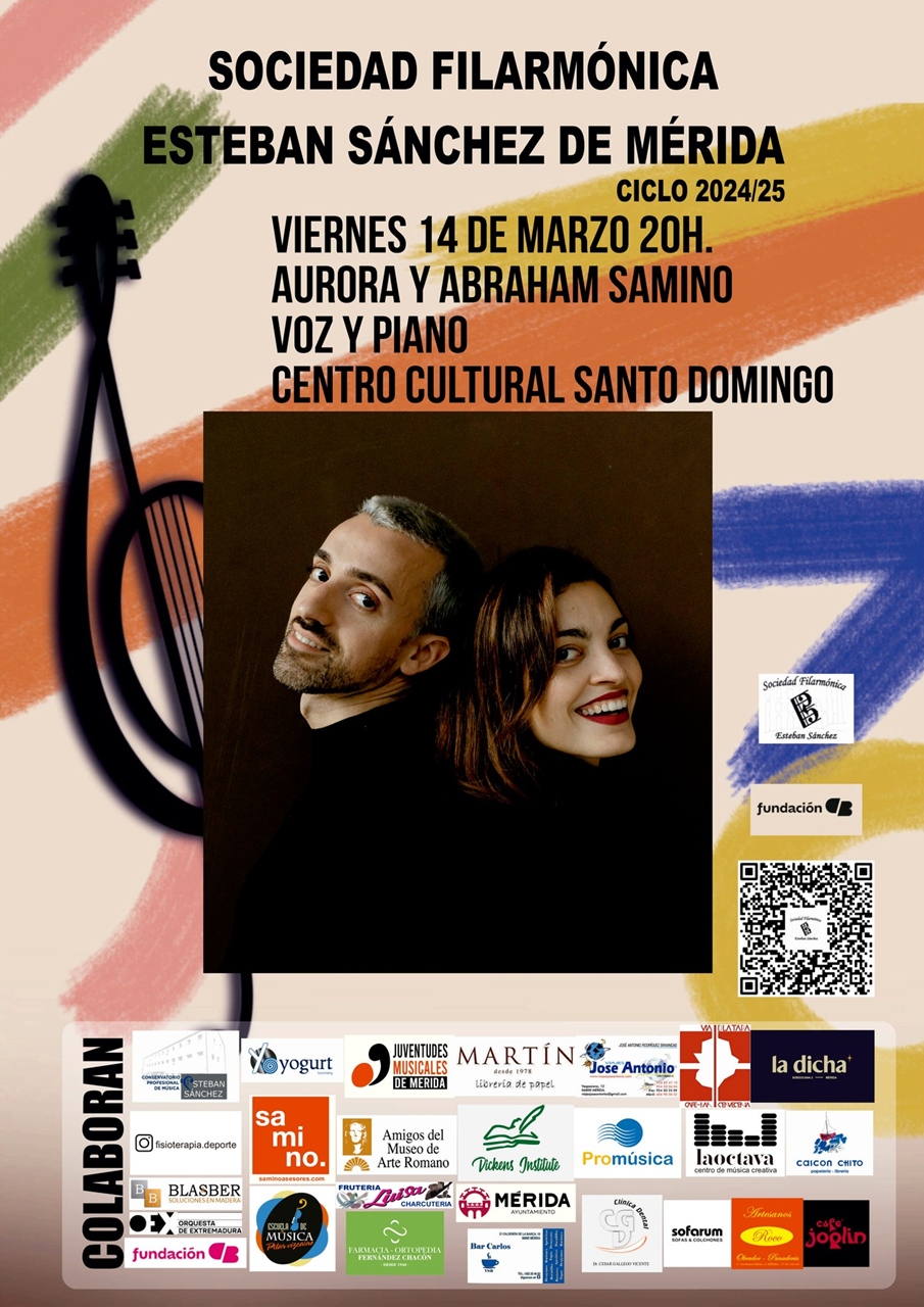 El Auditorio del Centro Cultural Santo Domingo de la Fundación CB de Mérida acoge otro concierto del ciclo anual de la Sociedad Filarmónica Esteban Sánchez/Juventudes Musicales de Mérida que esta ocasión correrá a cargo de Aurora y Abraham Samino (voz y piano), que ofrecerán un concierto al más puro estilo de Broadway con canciones de musical y personajes de películas conocidos por todos; la música trazará un recorrido emocionante por sus historias y nos descubrirá su auténtico mensaje.