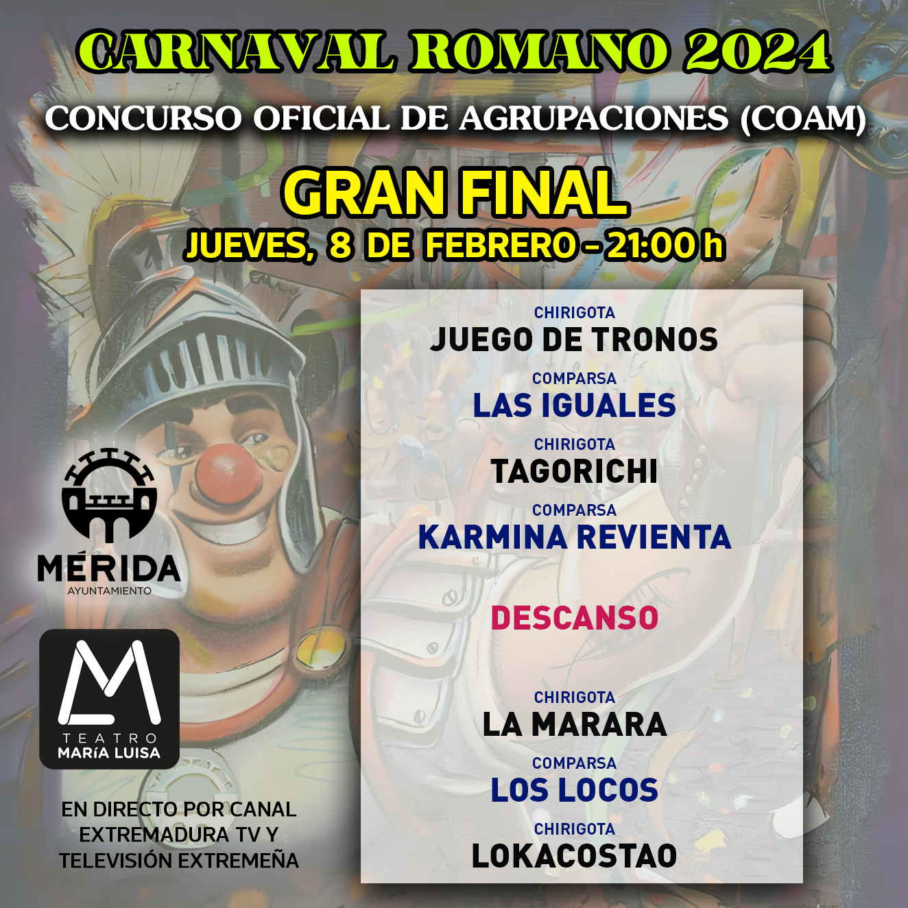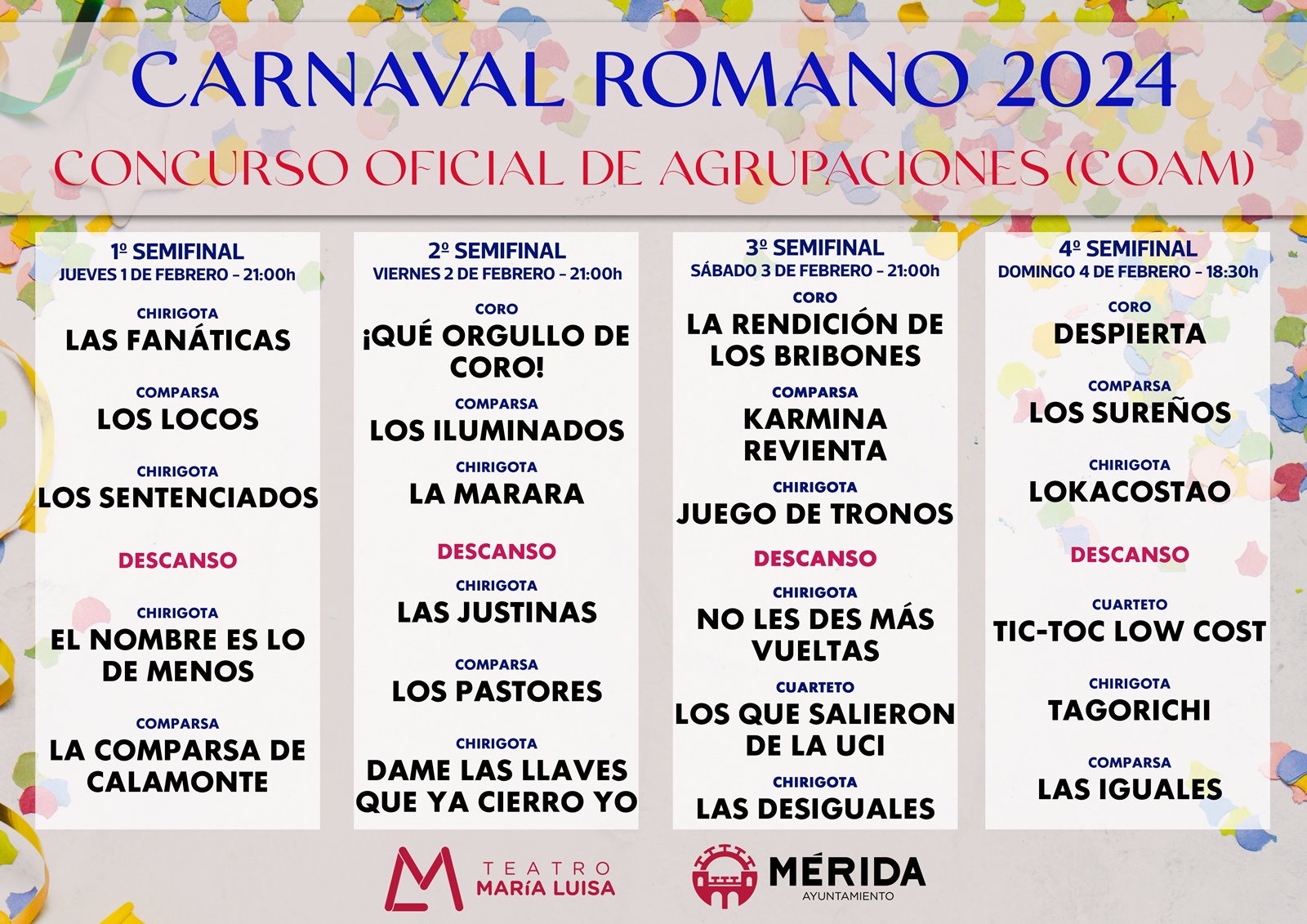 23 agrupaciones (11 chirigotas, 7 comparsas, 3 coros y 2 cuartetos) participarán en el Concurso Oficial de Agrupaciones del Carnaval Romano 2024 que se dividirá en 4 semifinales y una final que se celebrarán en el Teatro María Luisa. Las semifinales se celebrarán del 1 al 4 de febrero y la gran final tendrá lugar el jueves 8 de febrero.