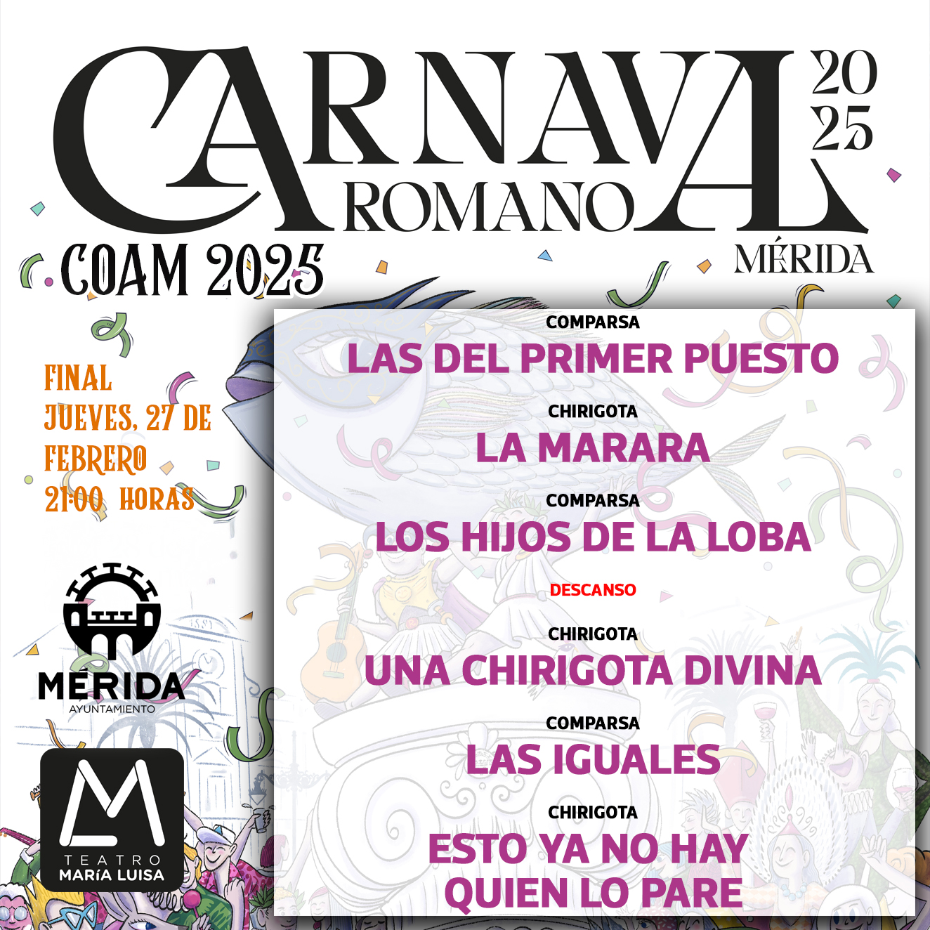 19 agrupaciones (9 chirigotas, 8 comparsas y 2 coros) participan en el Concurso Oficial de Agrupaciones del Carnaval Romano 2025 que comenzó con las 4 sesiones de preliminares del 13 al 16 de febrero para seguir con las 2 semifinales que tuvieron lugar el 21 y 23 de febrero.