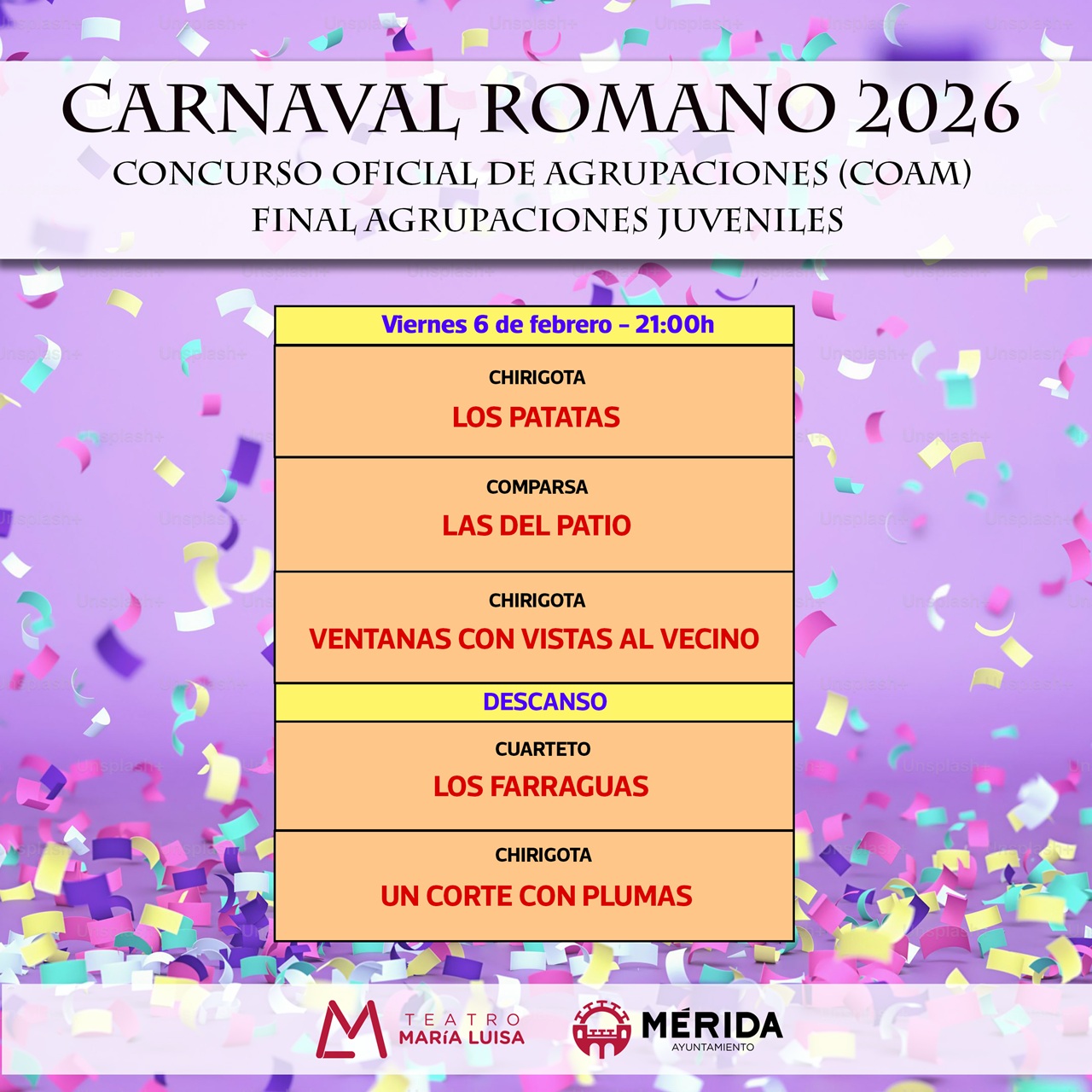 El viernes 6 de febrero tendrá lugar en el Teatro María Luisa el Concurso Oficial de Agrupaciones Juveniles COAM del Carnaval Romano 2026 en el que participarán 5 agrupaciones (3 chirigotas, 1 comparsas y un cuarteto)
