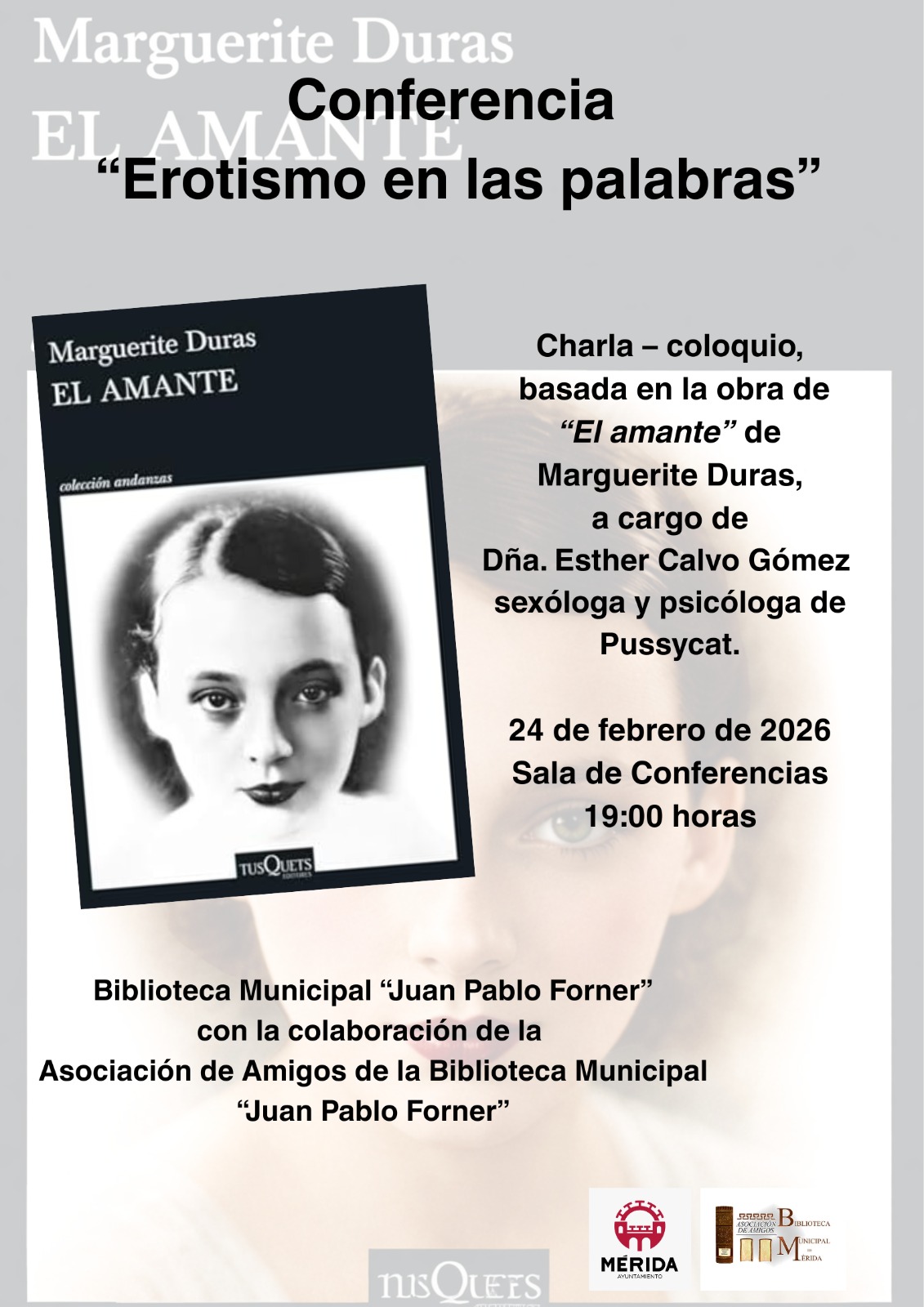 La Biblioteca Juan Pablo Forner organiza el próximo día 24 de febrero, a las 19:00 horas, una charla-coloquio dedicada a la obra ‘El amante’, de Marguerite Duras, centrada en el erotismo y la potencia expresiva del lenguaje literario. La conferencia a cargo de Esther Calvo Gómez, sexóloga y psicóloga de Pussycat, quien guiará la reflexión desde una mirada interdisciplinar que une literatura, deseo y subjetividad.