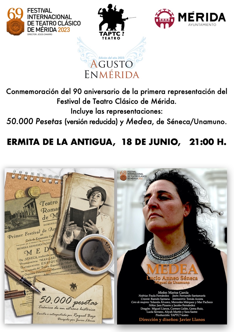 El domingo 18 de junio, a las 21:00 h., en las traseras de la Ermita de La Antigua se inician las actividades de AGUSTO EN MÉRIDA de Taptc Teatro con un programa doble que incluye, en modo introductorio, una fragmento del espectáculo ‘50.000 Pesetas’ escrito e interpretado por Raquel Bazo y ‘Medea’ de Séneca, traducida por Miguel de Unamuno.