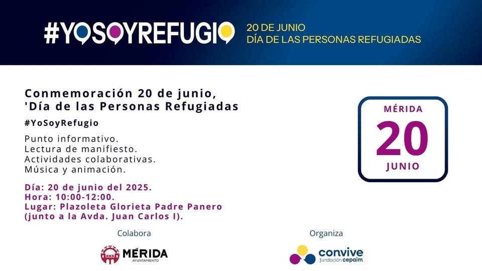 El viernes 20 de junio, de 10:00 a 12:00 horas, la plaza del Padre Panero de La Antigua acoge diversas actividades para conmemorar el Día Internacional de las Personas Refugiadas. Un espacio para reflexionar, compartir y promover la convivencia intercultural que incluirá Lectura de Manifiesto, stand informativo, actividades comunitarias de sensibilización, música y animación. Organiza Fundación Cepaim con la colaboración del Ayuntamiento de Mérida