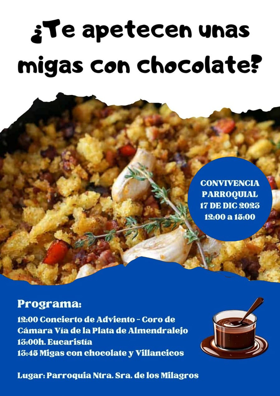 A las 12:00h tendrá lugar un concierto de Adviento por el Coro de Cámara «Vía de la Plata» de Almendralejo. A las 13:00 tendrá lugar la Eucaristía y al finalizar se darán Migas con Chocolate, gratis, a todos los asistentes. A la vez, los grupos de niños/as que asisten a catequesis cantarán villancicos