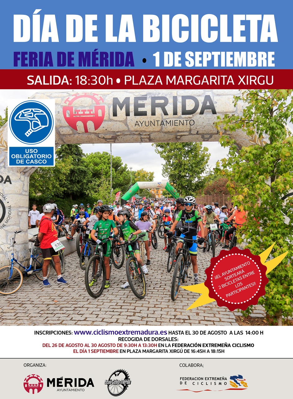 La Feria de Mérida celebra, el próximo domingo 1 de septiembre de 2024, a las 18:30 horas, el tradicional Día de la bicicleta, actividad de carácter familiar lúdica-festiva. La misma tendrá la salida y meta en la Plaza Margarita Xirgu