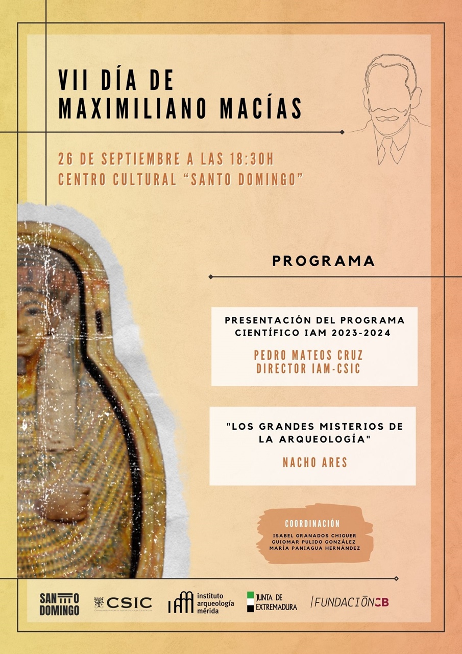 El martes 26 de septiembre, el Instituto de Arqueología-Mérida (CSIC-Junta de Extremadura) celebra el ‘VII DÍA DE MAXIMILIANO MACÍAS’​ con la presentacion de su programa científico y, en esta ocasión, con la participación del director y presentador del programa SER Historia, Nacho Ares, que hablará de ‘Los grandes misterios de la arqueología’. A las 18:30 h en el Centro Cultural «Santo Domingo». Entrada libre hasta completar aforo