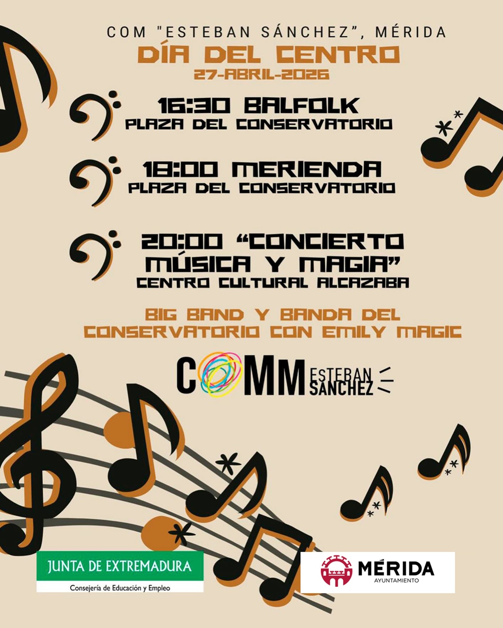20:00 h. Concierto “Música y Magia”: Como broche de oro, el Centro Cultural Alcazaba acogerá la actuación de la Big Band y la Banda del Conservatorio, que se fusionarán con el ilusionismo del espectacular ‘Emily Magic’.